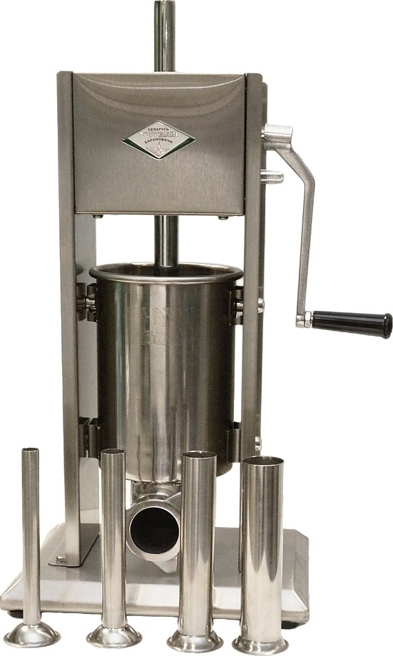Колбасный шприц БЕЛТОРГМАШ ШКВ-3 используется на предприятиях общественного питания, торговли и пищевых производствах для набивки оболочки в процессе изготовления разнообразных колбасных изделий. Модель оснащена поршеневым механизмом с ручным приводом, устойчивым основанием и удобной рукояткой. Материал корпуса - нержавеющая сталь.