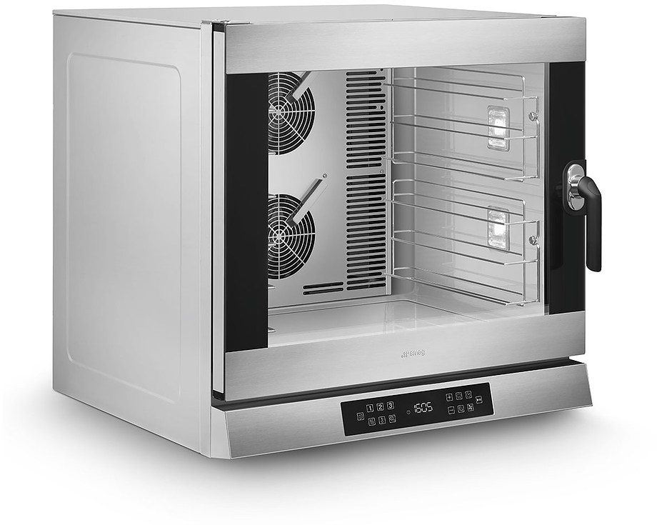 Конвекционная печь Smeg ALFA 625 E1HDSR используется для выпечки хлебобулочных и кондитерских изделий и приготовления блюд на предприятиях общественного питания, торговли и пищевых производствах. Модель оснащена электронным управлением, ручным переключением термостата безопасности, автоотключением при открытой двери, таймером, принудительной вентиляцией и регулируемыми ножками. Материал корпуса и камеры - высококачественная нержавеющая сталь.