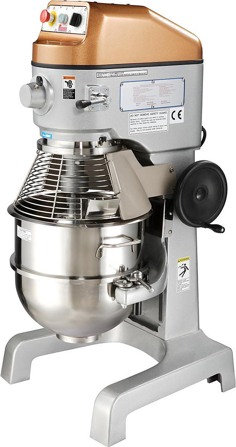 Месильный орган вращается вокруг своей оси и оси дежи, тем самым обеспечивая получение однородной массы. Миксер оснащен механической коробкой передач.