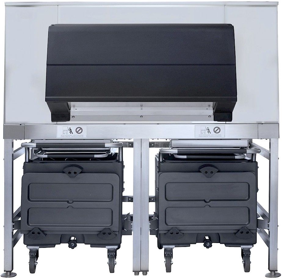 Бункер для льда SCOTSMAN (FRIMONT) SIS 1350 в комплекте с двумя теплоизолированными тележками ёмкостью 73 кг каждая для удобства транспортировки льда. В конструкции бункера реализован следующий принцип: новый лед подается к окну для выгрузки только после выемки ранее изготовленного льда. Это обеспечивает постоянную свежесть льда и высокий уровень гигиены. Лед из бункера падает в тележку под действием силы тяжести, что исключает утомительную выемку вручную.