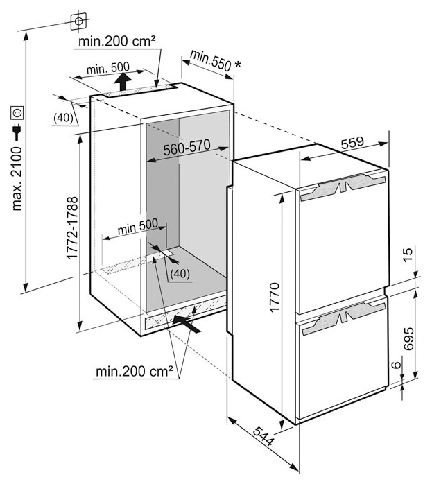 - Размеры ниши: 560-570х550х1772-1788 мм
