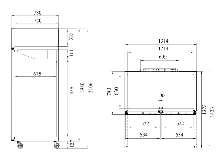 • Глубина с открытыми дверьми: 1373 мм