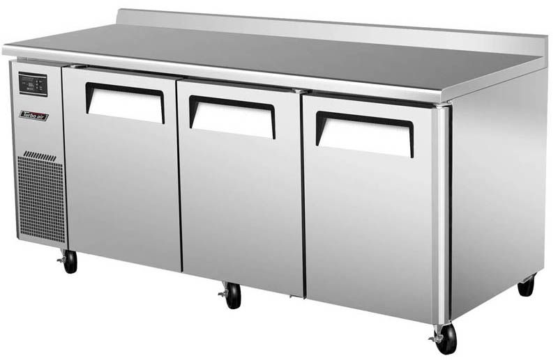 Холодильный стол Turbo air KWR18-3 предназначен для раскатки теста, обработки, охлаждения и кратковременного хранения продуктов и напитков на предприятиях общественного питания и торговли. Корпус выполнен из нержавеющей стали (гальванизированная сталь на оборотной стороне и внизу) с применением пожаробезопасных стенок толщиной 60 мм, уплотнения - из АБС-пластика (акрилонитрилбутадиенстирола), не пропускающего конденсата, пол - из нержавеющей стали с алюминиевыми вставками по бокам и сзади оборудования, регулируемые полки - из толстой стальной проволоки с виниловым покрытием.