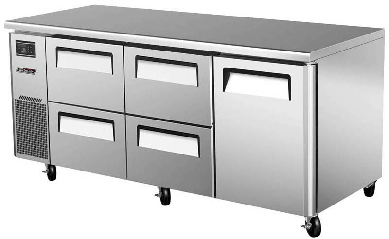 Холодильный стол Turbo air KUR18-2D-4 предназначен для раскатки теста, обработки, охлаждения и кратковременного хранения продуктов и напитков на предприятиях общественного питания и торговли. Корпус выполнен из нержавеющей стали (гальванизированная сталь на оборотной стороне и внизу) с применением пожаробезопасных стенок толщиной 60 мм, уплотнения - из АБС-пластика (акрилонитрилбутадиенстирола), не пропускающего конденсата, пол - из нержавеющей стали с алюминиевыми вставками по бокам и сзади оборудования, тройные направляющие - из высококачественной нержавеющей стали.