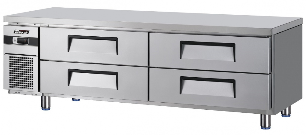 Холодильный стол Turbo air KUC18-4 предназначен для хранения овощей, полуфабрикатов из мяса и рыбы, а так же других скоропортящихся продуктов на предприятиях общественного предприятия и торговли. Сверхпрочная столешница шеф-базы изготовлена из цельного куска нержавеющей стали для повышения прочности. За счет использования специального слоя теплоизоляции на столешницу можно устанавливать любое тепловое оборудование. Столешницы этой модели выдерживают до 650 кг нагрузки. Шеф-база Turbo Air спроектирована с увеличенной и более сбалансированной (CFC free) системой охлаждения. Она включает в себя более мощный испаритель и конденсатор, обладающие большой эффективностью и позволяющие добиться быстрого охлаждения продуктов.