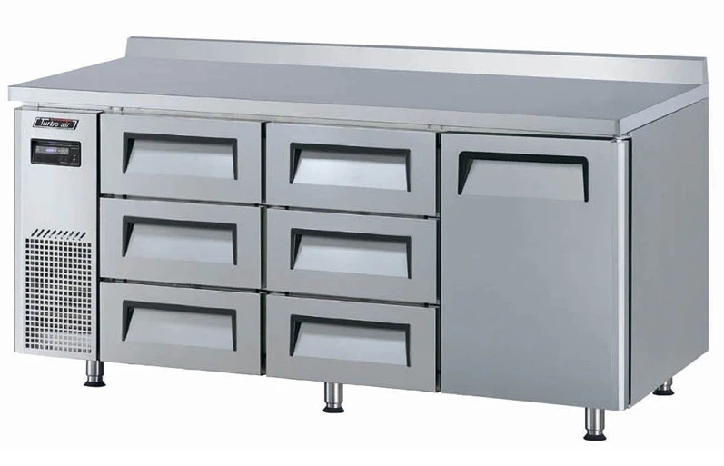 Холодильный стол Turbo air KWR18-3D-6-600 используется для охлаждения, заморозки и длительного хранения пищевых продуктов, а также для обработки ингредиентов на предприятиях общественного питания, торговли и пищевых производствах. Динамическая система охлаждения. Стол установлен на 6 колесах, оснащен дверью, полкой и 6 ящиками. Материал корпуса и направляющих - нержавеющая сталь, материал задней и нижней панелей - гальванизированная сталь, материал пола - нержавеющая сталь с алюминиевыми вставками, материал полок - толстая стальная проволока с виниловым покрытием, материал уплотнения - ABS-пластик.