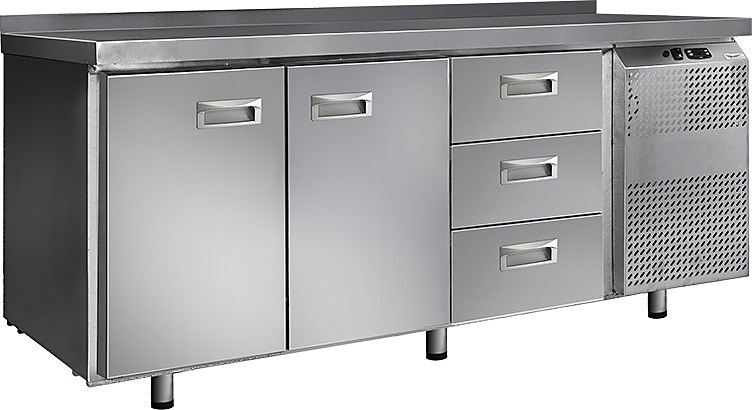 Холодильный стол Finist СХС-700-2/3 используется на предприятиях общественного питания, торговли и пищевых производствах для хранения и обработки полуфабрикатов из мяса и рыбы, заготовок для салата, охлажденных напитков и прочих пищевых продуктов. Управление при помощи кнопочной панели управления, оснащенной цифровым дисплеем. 2 холодильные камеры с распашными дверцами, 3 выдвижных ящика, агрегатный отсек располагается сбоку. Стол установлен на ножки с подпятниками. Материал корпуса - нержавеющая сталь.