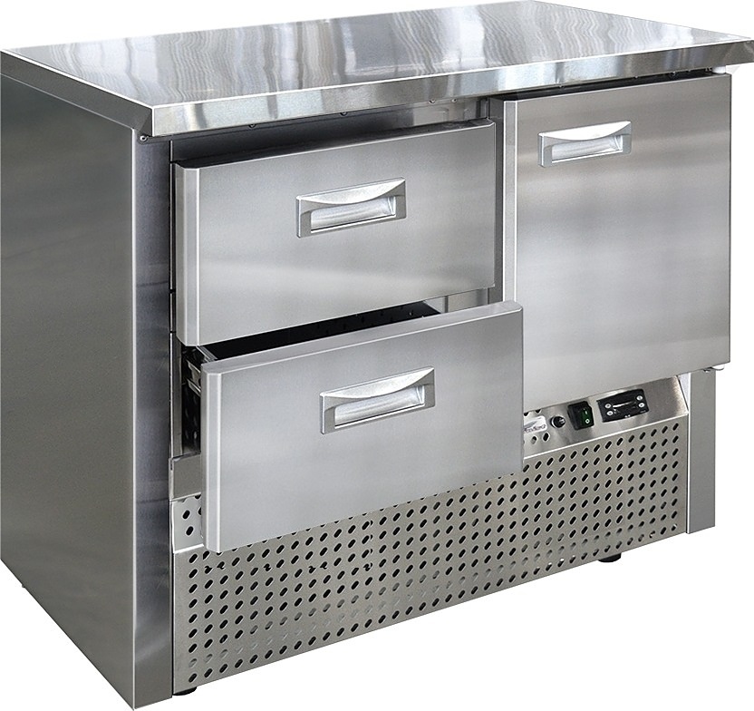 Холодильный стол Finist СХСн-600-1/2 используется на предприятиях общественного питания, торговли и пищевых производствах для хранения и обработки полуфабрикатов из мяса и рыбы, заготовок для салата, охлажденных напитков и прочих пищевых продуктов. Управление при помощи кнопочной панели управления, оснащенной цифровым дисплеем. Камеры с распашными дверцами, 2 выдвижных ящика, агрегатный отсек располагается снизу. Стол установлен на ножки с подпятниками. Материал корпуса - нержавеющая сталь.