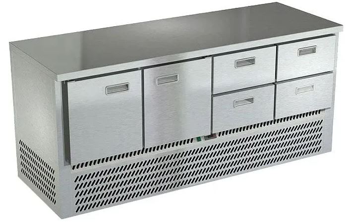 Холодильный стол Техно-ТТ СПН/О-122/24-1907 предназначается для раскатки теста, обработки, охлаждения и кратковременного хранения продуктов и напитков на предприятиях общественного питания, торговли и пищевых производствах. Секции оснащены направляющими и решетчатыми полками, двери и ящики - доводчиками. Материал корпуса и столешницы - нержавеющая сталь AISI 430, материал задней панели и дна - оцинкованная сталь.