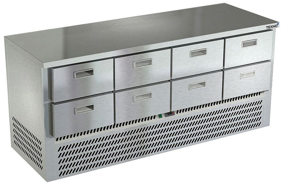 Холодильный стол Техно-ТТ СПН/О-123/08-1906 предназначается для раскатки теста, обработки, охлаждения и кратковременного хранения продуктов и напитков на предприятиях общественного питания, торговли и пищевых производствах. Секции оснащены направляющими и ящиками с доводчиками. Материал корпуса и столешницы - нержавеющая сталь AISI 430, материал задней панели и дна - оцинкованная сталь.
