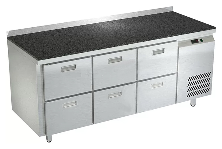 Холодильный стол Техно-ТТ СПБ/О-423/06-1806 предназначается для раскатки теста, обработки, охлаждения и кратковременного хранения продуктов и напитков на предприятиях общественного питания, торговли и пищевых производствах. Секции оснащены направляющими и ящиками с доводчиками. Материал корпуса - нержавеющая сталь AISI 430, материал столешницы - гранит (толщина 20 мм), материал задней панели и дна - оцинкованная сталь.