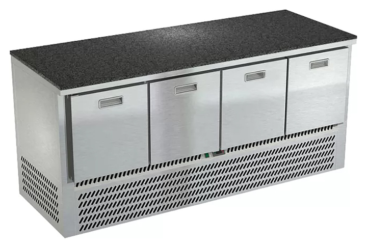 Холодильный стол Техно-ТТ СПН/О-323/04-1907 предназначается для раскатки теста, обработки, охлаждения и кратковременного хранения продуктов и напитков на предприятиях общественного питания, торговли и пищевых производствах. Секции оснащены направляющими и ящиками с доводчиками. Материал корпуса - нержавеющая сталь AISI 430, материал столешницы - гранит (толщина 20 мм), материал задней панели и дна - оцинкованная сталь.
