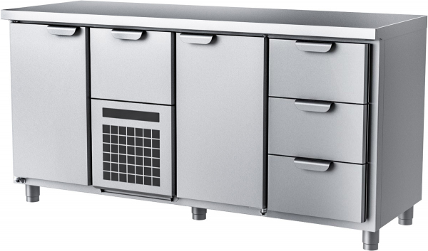 Холодильный стол HappyChef TC BD 1-CBR-1-3 используется на предприятиях общественного питания, торговли и пищевых производствах для хранения и обработки продуктов питания в охлажденном виде. Модель оснащена быстросъемными модулями, моющимся фильтром и регулируемыми ножками. Материал корпуса - высококачественная нержавеющая сталь AISI 430, материал столешницы - высококачественная нержавеющая сталь AISI 304 (толщина 2 мм).