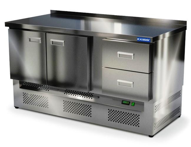 Холодильный стол КАМИК СО-22156Н используется на предприятиях общественного питания и торговли для охлаждения и хранения продуктов, напитков и готовых блюд. Конструкция разделена на секции, каждая из которых оборудована сетчатой полкой и парой направляющих. Корпус выполнен из нержавеющей стали AISI 430 толщиной 1 мм, столешница - из нержавеющей стали AISI 304 толщиной 1,5 мм.