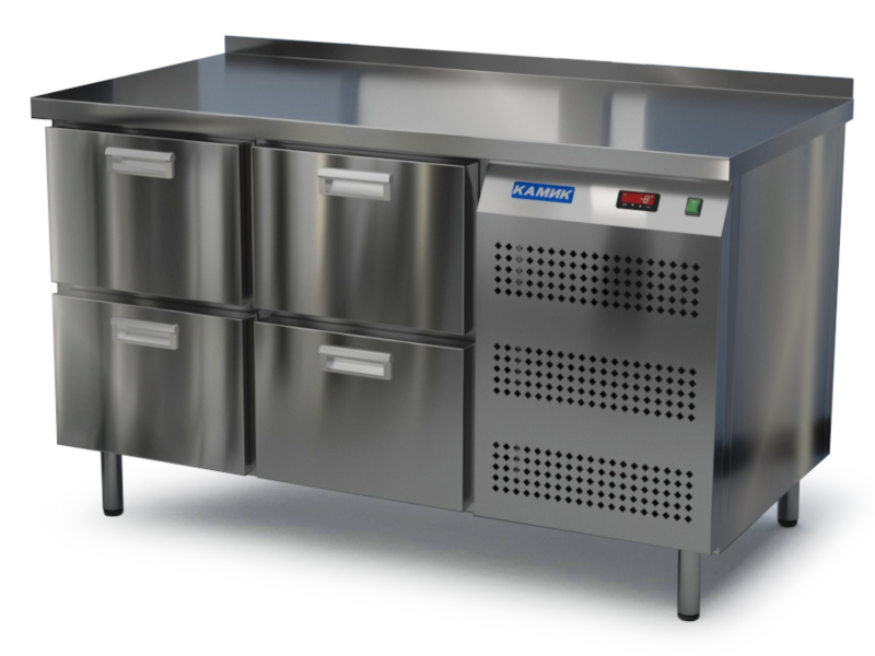 Холодильный стол КАМИК СО-04147 используется на предприятиях общественного питания и торговли для охлаждения и хранения продуктов, напитков и готовых блюд. Конструкция разделена на секции, каждая из которых оборудована сетчатой полкой и парой направляющих. Корпус выполнен из нержавеющей стали AISI 430 толщиной 1 мм, столешница - из нержавеющей стали AISI 304 толщиной 1,5 мм.