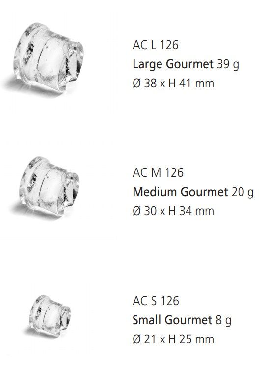 Лед цилиндрической формы "гурмэ" используется для охлаждения алкогольных и безалкогольных напитков, а также для приготовления коктейлей в первоклассных гостиницах, изысканных ресторанах и элитных барах. Каждый кубик представляет собой настоящее произведение искусства: кристально прозрачный, идеальной формы, твердый и долго не тающий лёд, по форме напоминающий наперсток.