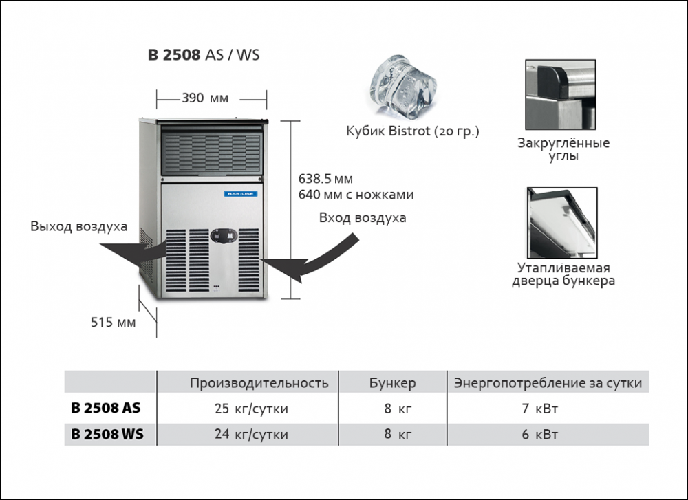 Льдогенератор BAR LINE (SCOTSMAN) B 2508 AS используется для производства кубикового льда Bistrot в форме "наперстка" на предприятиях общественного питания и торговли. Корпус выполнен из нержавеющей стали с антикоррозионной стойкостью. Оборудование работает на хладагенте R134a.