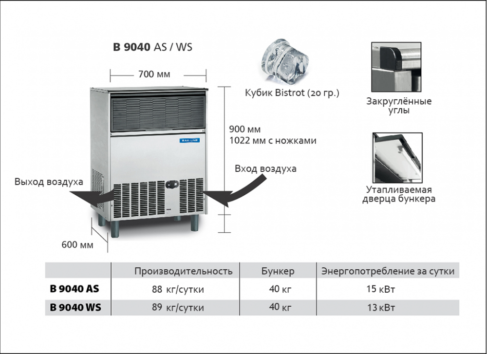 - Изолированная дверца бункера и емкость для хранения льда минимизируют конденсацию воздуха и образование воды на поверхностях оборудования