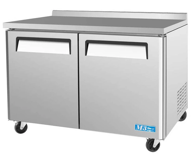 Морозильный стол Turbo air CMWF-48 предназначается для обработки, заморозки и длительного хранения продуктов, полуфабрикатов и мороженого на предприятиях общественного питания, торговли, производствах. 2 двери с эргономичной ручкой. Стол установлен на 4 колеса (фронтальные со стопорами) и оснащен 2 регулируемыми полками. Материал корпуса и петель - нержавеющая сталь, материал задней стенки и пола - гальванизированная сталь, материал пола - нержавеющая сталь с алюминиевыми вставками, материал полок - толстая стальная проволока с виниловым покрытием.