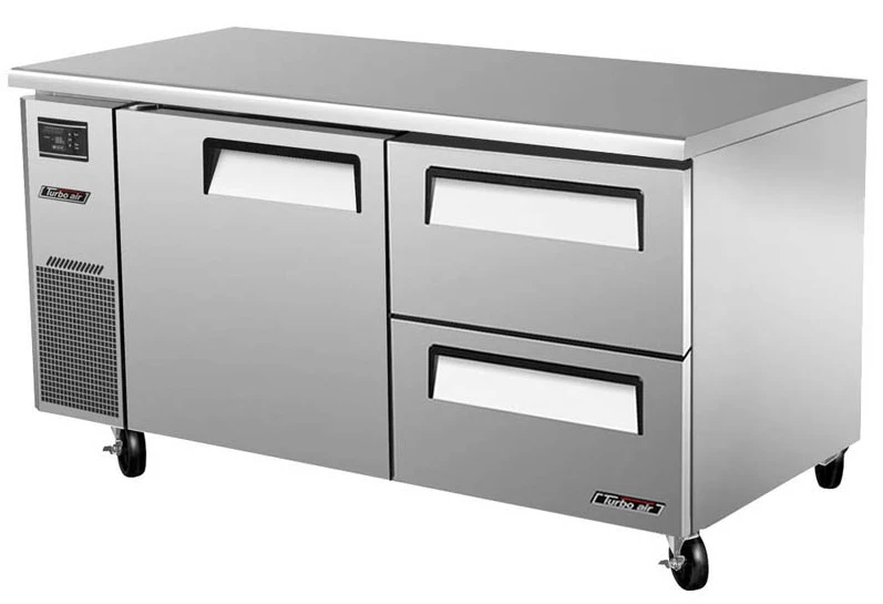 Морозильный стол Turbo air KUF15-2D-2-700 используется для охлаждения, заморозки и длительного хранения пищевых продуктов, а также для обработки ингредиентов на предприятиях общественного питания, торговли и пищевых производствах. Дверь, полка и 2 ящика. Стол установлен на 4 колесах (фронтальные со стопорами). Материал корпуса и направляющих - нержавеющая сталь, материал задней и нижней панелей - гальванизированная сталь, материал пола - нержавеющая сталь с алюминиевыми вставками, материал уплотнения - ABS-пластик.