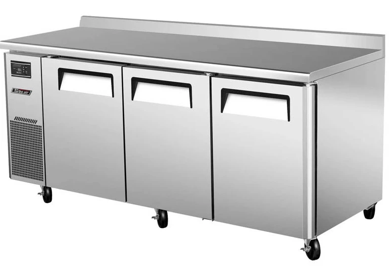 Морозильный стол Turbo air KWF18-3GN-700 используется для охлаждения, заморозки и длительного хранения пищевых продуктов, а также для обработки ингредиентов на предприятиях общественного питания, торговли и пищевых производствах. Динамическая система охлаждения. Стол установлен на 6 колесах (фронтальные со стопорами), оснащен 3 дверьми и 15 направляющими под гастроемкости. Материал корпуса и направляющих - нержавеющая сталь, материал задней и нижней панелей - гальванизированная сталь, материал пола - нержавеющая сталь с алюминиевыми вставками, материал полок - толстая стальная проволока с виниловым покрытием, материал уплотнения - ABS-пластик.