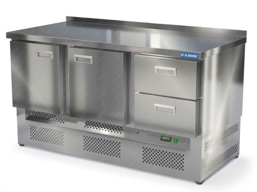 Морозильный стол КАМИК СМ-22157Н используется на предприятиях общественного питания и торговли для заморозки и длительного хранения продуктов, полуфабрикатов и мороженого. Конструкция разделена на секции, каждая из которых оборудована сетчатой полкой и парой направляющих. Корпус выполнен из нержавеющей стали AISI 430 толщиной 1 мм, столешница - из нержавеющей стали AISI 304 толщиной 1,5 мм.