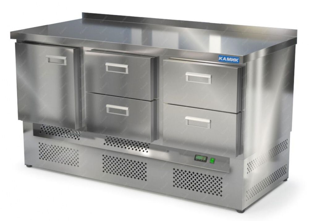 Морозильный стол КАМИК СМ-14157Н используется на предприятиях общественного питания и торговли для заморозки и длительного хранения продуктов, полуфабрикатов и мороженого. Конструкция разделена на секции, каждая из которых оборудована сетчатой полкой и парой направляющих. Корпус выполнен из нержавеющей стали AISI 430 толщиной 1 мм, столешница - из нержавеющей стали AISI 304 толщиной 1,5 мм.