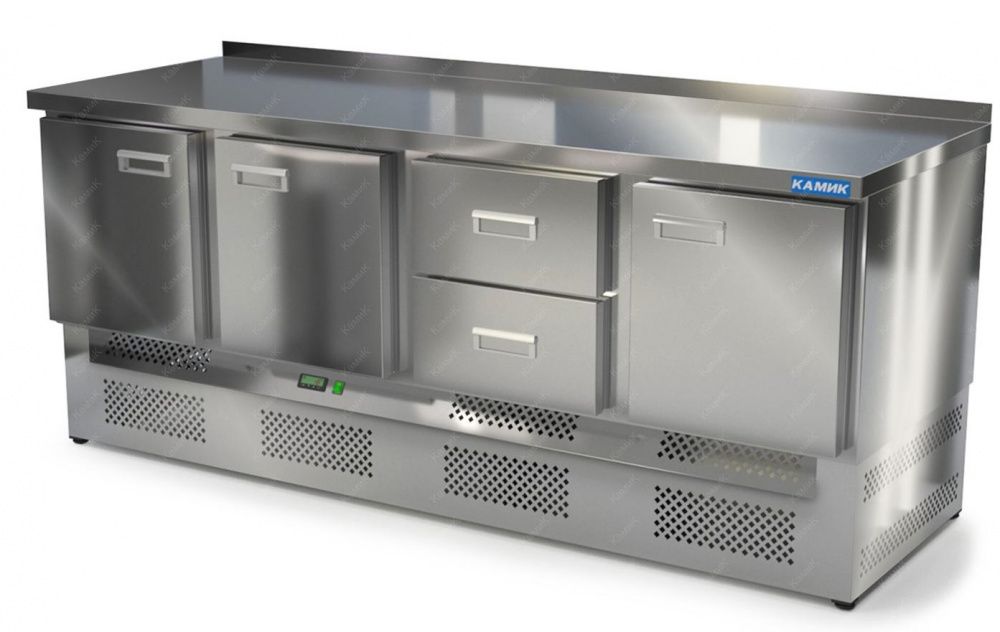 Морозильный стол КАМИК СМ-32207Н используется на предприятиях общественного питания и торговли для заморозки и длительного хранения продуктов, полуфабрикатов и мороженого. Конструкция разделена на секции, каждая из которых оборудована сетчатой полкой и парой направляющих. Корпус выполнен из нержавеющей стали AISI 430 толщиной 1 мм, столешница - из нержавеющей стали AISI 304 толщиной 1,5 мм.