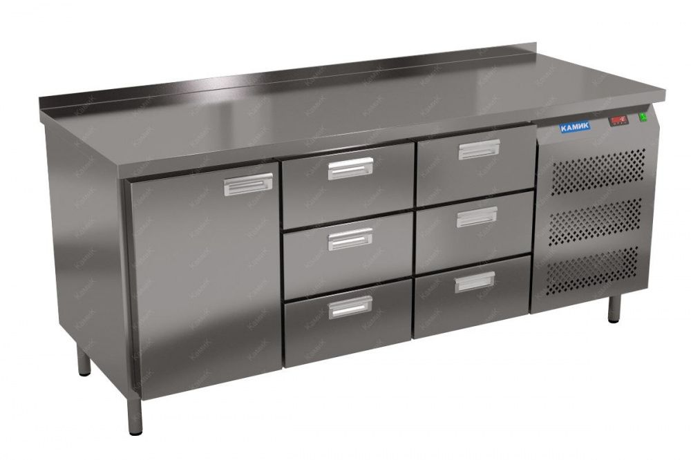 Морозильный стол КАМИК СМ-16237 используется на предприятиях общественного питания и торговли для заморозки и длительного хранения продуктов, полуфабрикатов и мороженого. Конструкция разделена на секции, каждая из которых оборудована сетчатой полкой и парой направляющих. Корпус выполнен из нержавеющей стали AISI 430 толщиной 1 мм, столешница - из нержавеющей стали AISI 304 толщиной 1,5 мм.