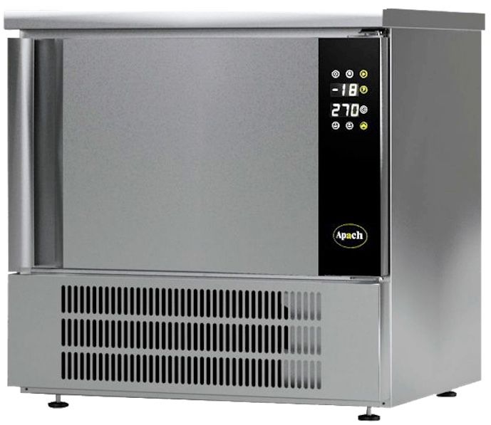 Шкаф шоковой заморозки Apach APR9/5 TLP предназначен для быстрой заморозки продуктов и приготовленных блюд на предприятиях общественного питания и торговли. Модель с электронной панелью управления оснащена встроенным холодильным агрегатом, самозакрывающимися дверями с магнитным уплотнителем и регулируемыми по высоте ножками. Корпус и внутренняя камера выполнены из нержавеющей стали AISI 304, днище, потолок и тыльная часть - из оцинкованного листа, изоляция - из пенополиуретана толщиной 60 мм.