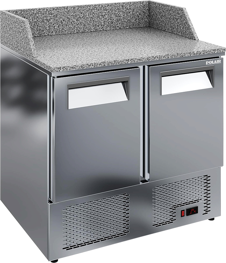 Холодильный стол для пиццы POLAIR TMi2GNpizza-GC серии Grande используется на предприятиях общественного питания, торговли и пищевых производствах для раскатки теста, хранения и обработки ингредиентов перед приготовлением пиццы. Данная модель обеспечивает механическую прочность, термоизоляцию и герметичность. Материал внешнего и внутреннего корпуса и дверей - высококачественная нержавеющая сталь, материал столешницы и борта - натуральный гранит, материал теплоизоляции - пенополиуретан, материал полок - крашенная оцинкованная проволока.