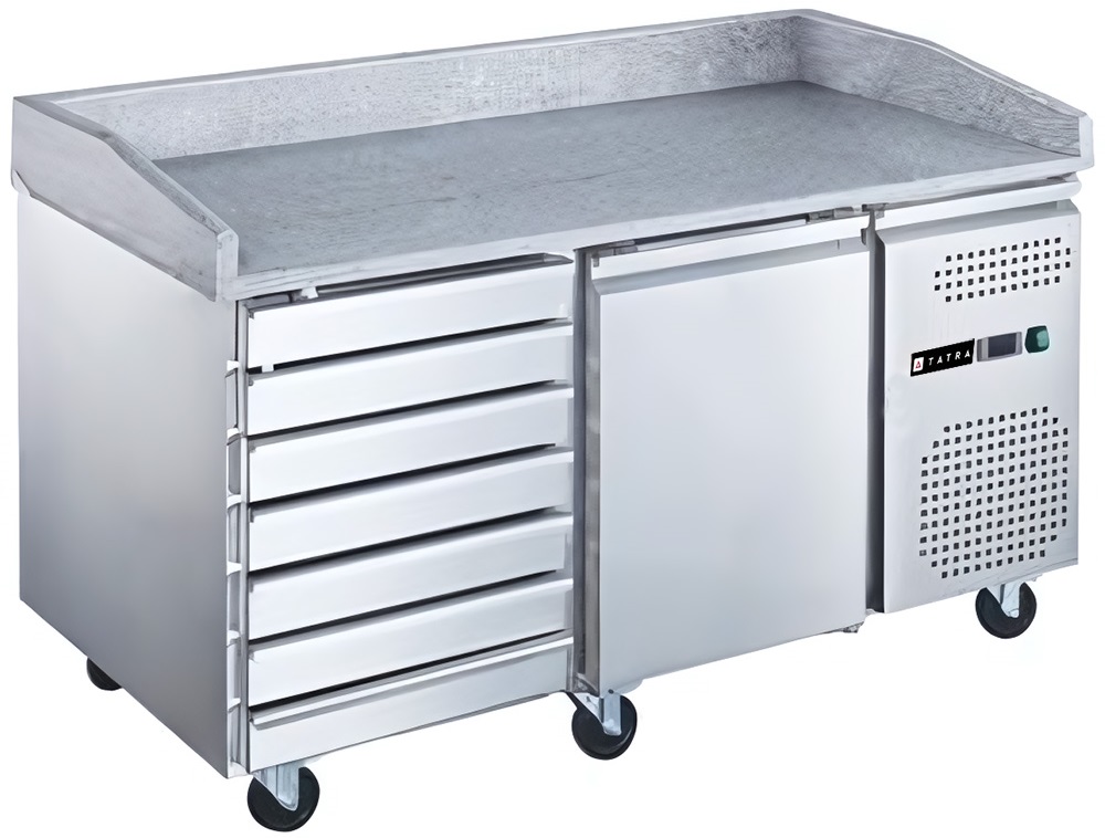 Холодильный стол Tatra TPZEN1D7 STB используется на предприятиях общественного питания, торговли и пищевых производствах для приготовления пиццы и хранения заготовок. Модель оснащена цифровым термостатом, эластичным уплотнителем, бортами с трех сторон и передвижными колесами, два с тормозами. Материал корпуса - высококачественная нержавеющая сталь.