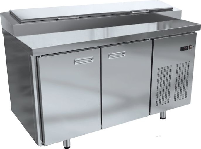 Холодильный стол KRONER СХП 2-140-70 используется на предприятиях общественного питания, торговли и пищевых производствах для раскатки теста, хранения и обработки ингредиентов перед приготовлением пиццы. Модель оснащена электронным управлением, автоматической оттайкой, встроенными ручками и регулируемыми ножками. Материал цельнозаливного корпуса, дверей и столешницы - шлифованная высококачественная нержавеющая сталь, материал задней стенки и дня - оцинкованная сталь.