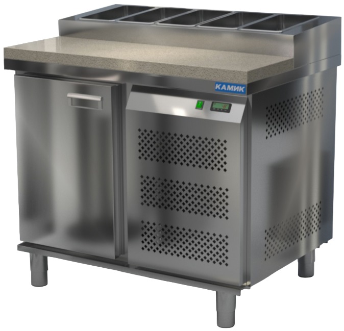 Холодильный стол КАМИК СОП-101073К используется на предприятиях общественного питания и торговли для охлаждения и хранения продуктов, напитков и готовых блюд, а также для раскатки теста и обработки ингредиентов для приготовления пиццы. Конструкция разделена на секции, каждая из которых оборудована сетчатой полкой и парой направляющих. Корпус выполнен из нержавеющей стали AISI 430 толщиной 1 мм, столешница - из нержавеющей стали AISI 304 толщиной 1 мм.