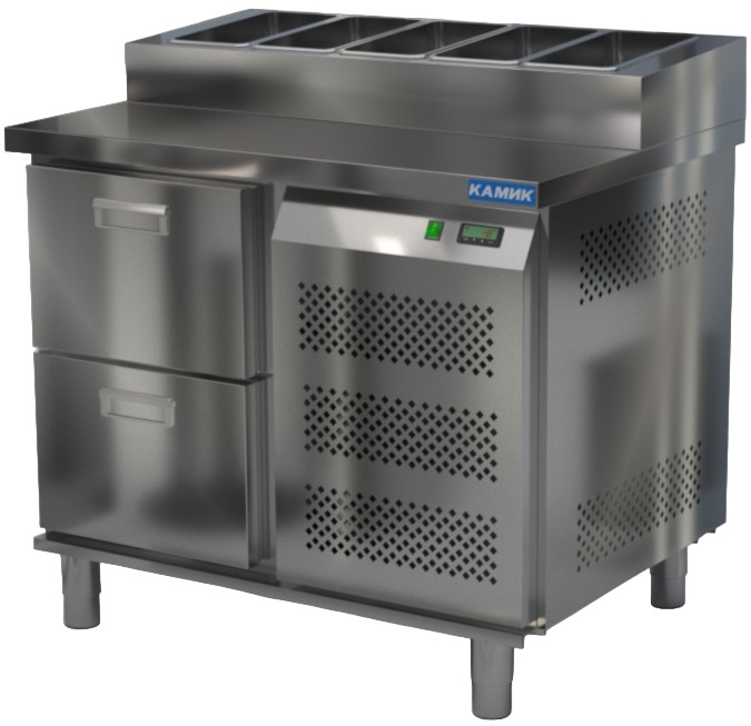 Холодильный стол КАМИК СОП-021073 используется на предприятиях общественного питания и торговли для охлаждения и хранения продуктов, напитков и готовых блюд, а также для раскатки теста и обработки ингредиентов для приготовления пиццы. Конструкция разделена на секции, каждая из которых оборудована сетчатой полкой и парой направляющих. Корпус выполнен из нержавеющей стали AISI 430 толщиной 1 мм, столешница - из нержавеющей стали AISI 304 толщиной 1 мм.