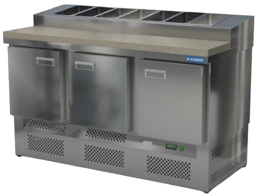 Холодильный стол КАМИК СОП-301573КН используется на предприятиях общественного питания и торговли для охлаждения и хранения продуктов, напитков и готовых блюд, а также для раскатки теста и обработки ингредиентов для приготовления пиццы. Конструкция разделена на секции, каждая из которых оборудована сетчатой полкой и парой направляющих. Корпус выполнен из нержавеющей стали AISI 430 толщиной 1 мм, столешница - из нержавеющей стали AISI 304 толщиной 1 мм.