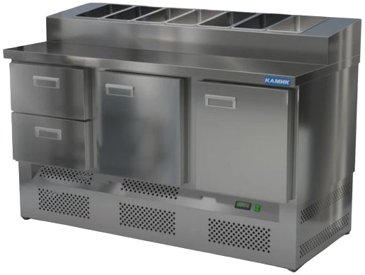 Холодильный стол КАМИК СОП-221576Н используется на предприятиях общественного питания и торговли для охлаждения и хранения продуктов, напитков и готовых блюд, а также для раскатки теста и обработки ингредиентов для приготовления пиццы. Конструкция разделена на секции, каждая из которых оборудована сетчатой полкой и парой направляющих. Корпус выполнен из нержавеющей стали AISI 430 толщиной 1 мм, столешница - из нержавеющей стали AISI 304 толщиной 1 мм.