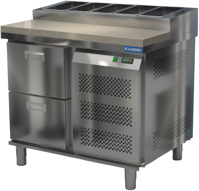 Холодильный стол КАМИК СОП-021076К используется на предприятиях общественного питания и торговли для охлаждения и хранения продуктов, напитков и готовых блюд, а также для раскатки теста и обработки ингредиентов для приготовления пиццы. Конструкция разделена на секции, каждая из которых оборудована сетчатой полкой и парой направляющих. Корпус выполнен из нержавеющей стали AISI 430 толщиной 1 мм, столешница - из нержавеющей стали AISI 304 толщиной 1 мм.