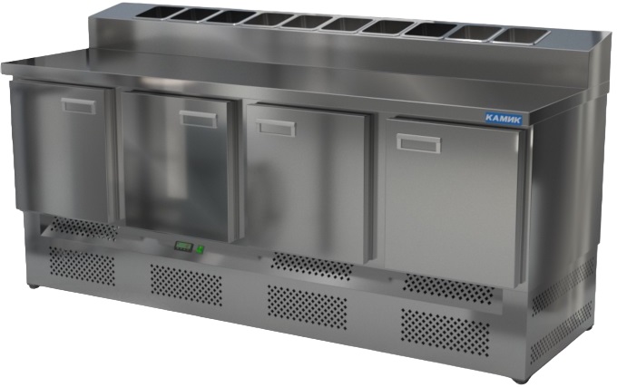Холодильный стол КАМИК СОП-402073Н используется на предприятиях общественного питания и торговли для охлаждения и хранения продуктов, напитков и готовых блюд, а также для раскатки теста и обработки ингредиентов для приготовления пиццы. Конструкция разделена на секции, каждая из которых оборудована сетчатой полкой и парой направляющих. Корпус выполнен из нержавеющей стали AISI 430 толщиной 1 мм, столешница - из нержавеющей стали AISI 304 толщиной 1 мм.