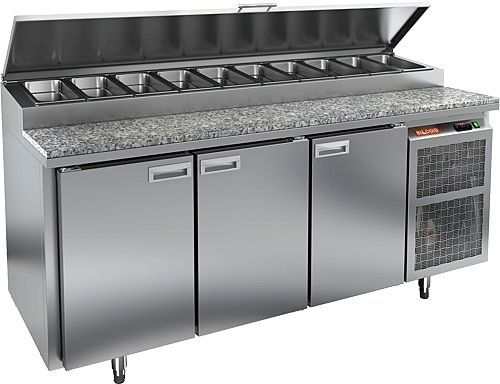 Охлаждаемый стол для пиццы HICOLD PZ1-111/GN (1/3) выполнен из нержавеющей стали марки AISI-304. Верх стола накрыт каменной столешницей.