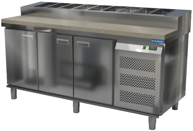 Холодильный стол КАМИК СОП-3018573К используется на предприятиях общественного питания и торговли для охлаждения и хранения продуктов, напитков и готовых блюд, а также для раскатки теста и обработки ингредиентов для приготовления пиццы. Конструкция разделена на секции, каждая из которых оборудована сетчатой полкой и парой направляющих. Корпус выполнен из нержавеющей стали AISI 430 толщиной 1 мм, столешница - из нержавеющей стали AISI 304 толщиной 1 мм.