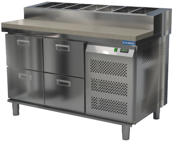 Холодильный стол КАМИК СОП-041476К используется на предприятиях общественного питания и торговли для охлаждения и хранения продуктов, напитков и готовых блюд, а также для раскатки теста и обработки ингредиентов для приготовления пиццы. Конструкция разделена на секции, каждая из которых оборудована сетчатой полкой и парой направляющих. Корпус выполнен из нержавеющей стали AISI 430 толщиной 1 мм, столешница - из нержавеющей стали AISI 304 толщиной 1 мм.