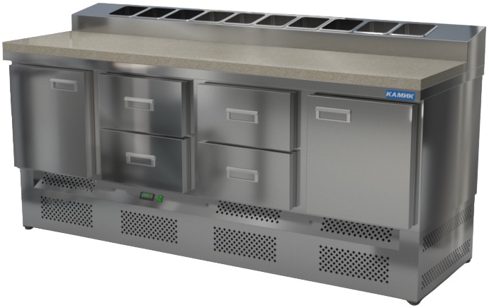 Холодильный стол КАМИК СОП-242076КН используется на предприятиях общественного питания и торговли для охлаждения и хранения продуктов, напитков и готовых блюд, а также для раскатки теста и обработки ингредиентов для приготовления пиццы. Конструкция разделена на секции, каждая из которых оборудована сетчатой полкой и парой направляющих. Корпус выполнен из нержавеющей стали AISI 430 толщиной 1 мм, столешница - из нержавеющей стали AISI 304 толщиной 1 мм.