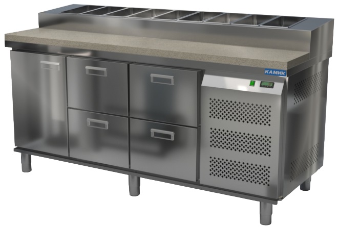 Холодильный стол КАМИК СОП-1418576К используется на предприятиях общественного питания и торговли для охлаждения и хранения продуктов, напитков и готовых блюд, а также для раскатки теста и обработки ингредиентов для приготовления пиццы. Конструкция разделена на секции, каждая из которых оборудована сетчатой полкой и парой направляющих. Корпус выполнен из нержавеющей стали AISI 430 толщиной 1 мм, столешница - из нержавеющей стали AISI 304 толщиной 1 мм.