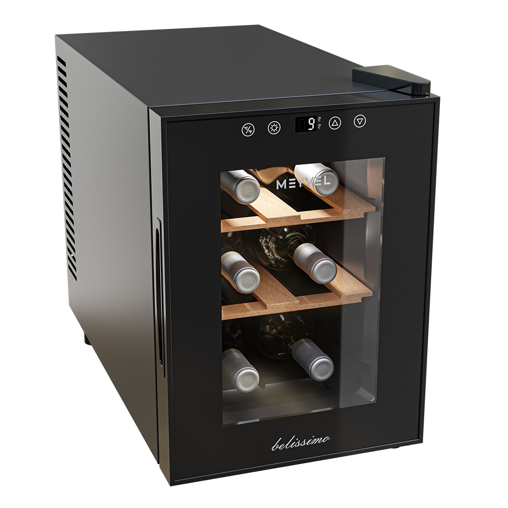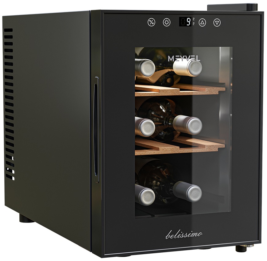 Винный шкаф Meyvel MV06-TBF1-Next используется на предприятиях общественного питания, торговли, пищевых производствах и в домашних условиях для демонстрационной выкладки, хранения и создания температурных условий, сохраняя все вкусовые свойства вина. Модель оснащена сенсорным управлением, электронным термостатом, LED-подсветкой, выдвижными полками, утопленной ручкой, регулируемыми ножками и поддоном для сбора конденсата. Материал корпуса - окрашенная сталь в черный цвет, материал двери - стекло с защитой от УФ-лучей, материал полок - натуральный бук.