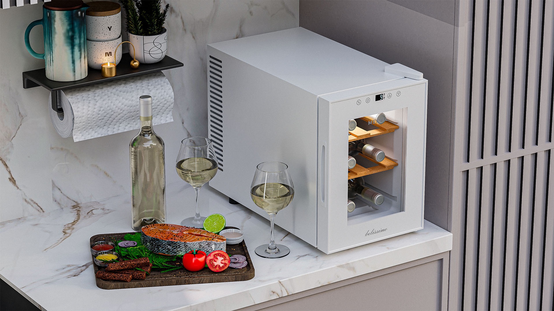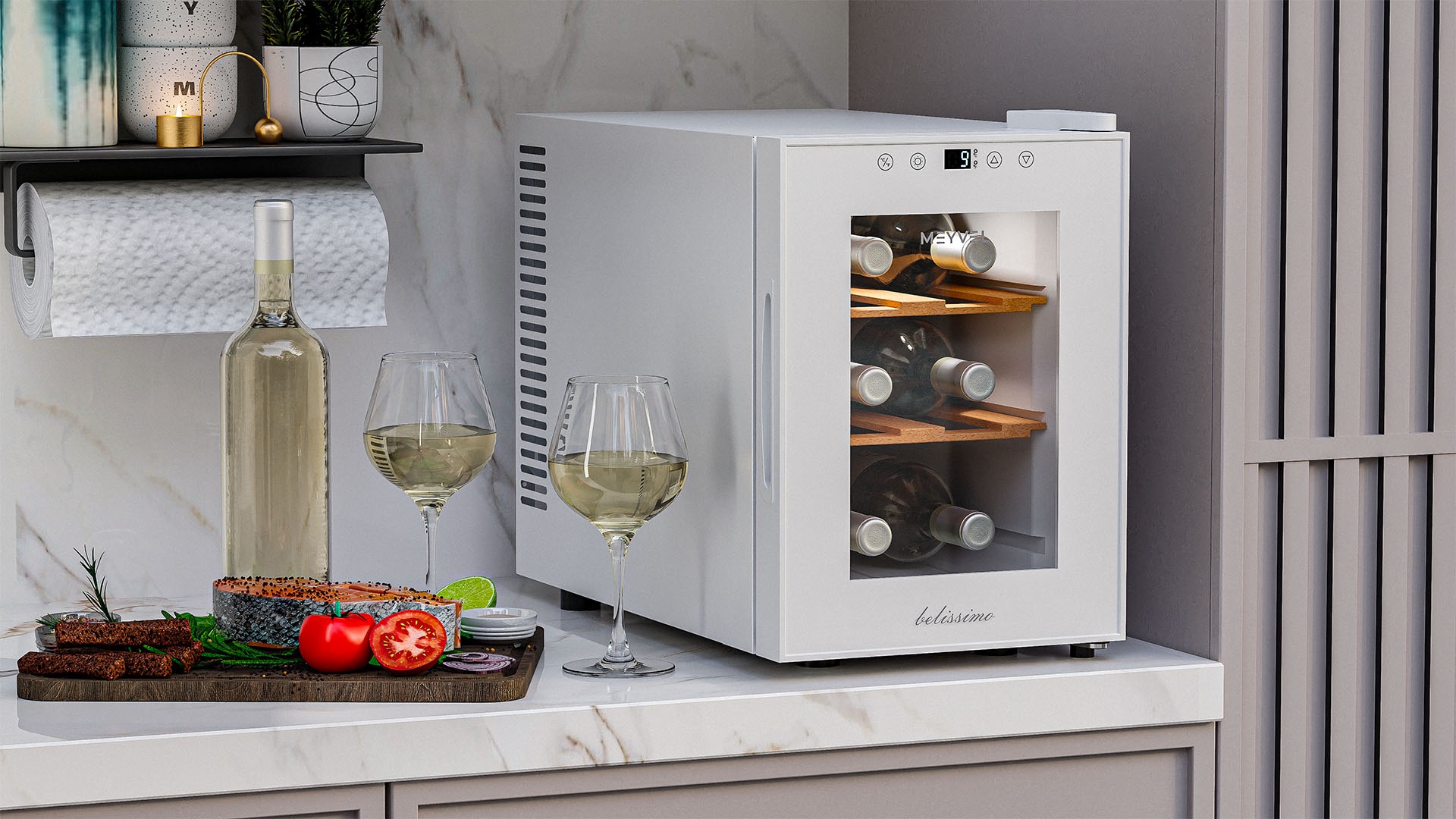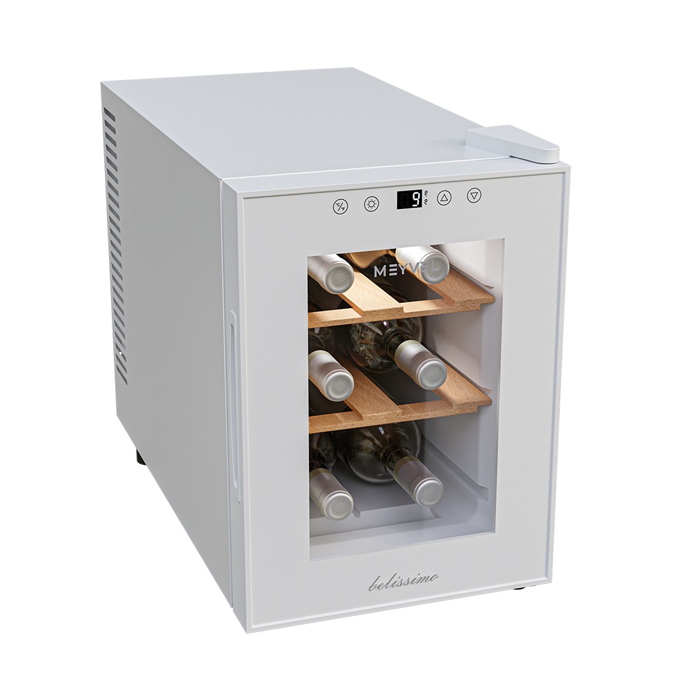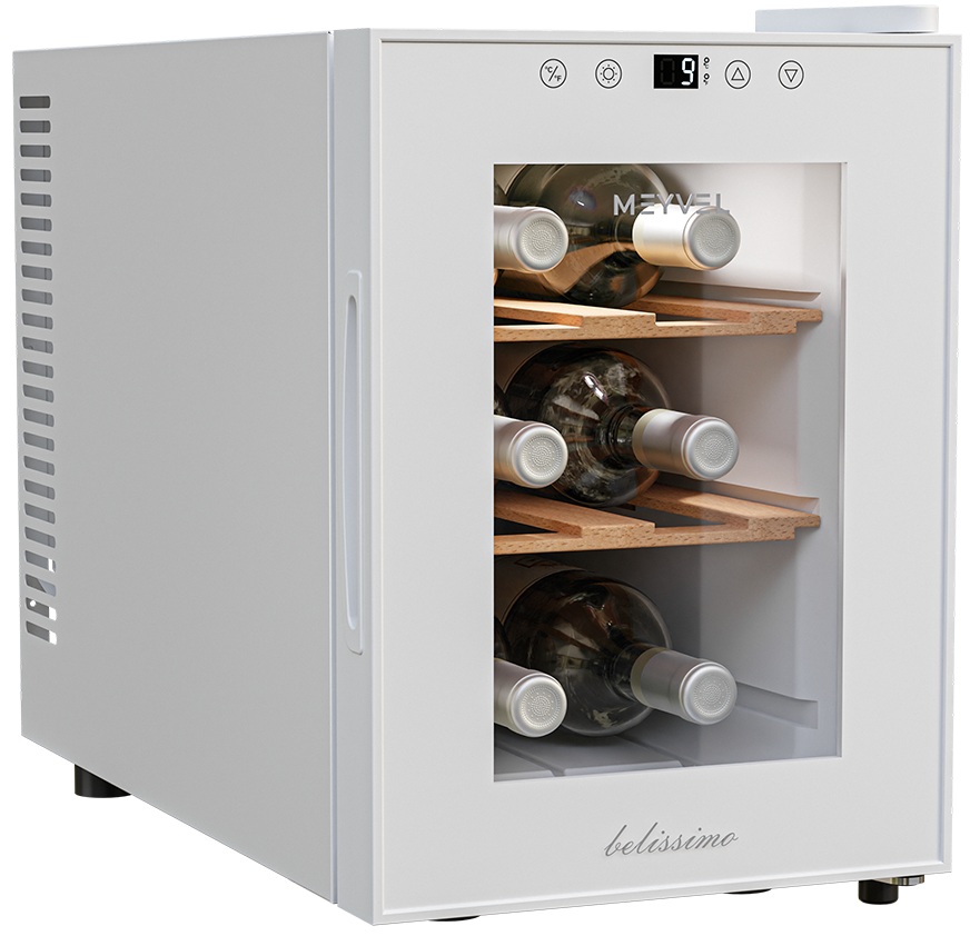 Винный шкаф Meyvel MV06-TWF1-Next используется на предприятиях общественного питания, торговли, пищевых производствах и в домашних условиях для демонстрационной выкладки, хранения и создания температурных условий, сохраняя все вкусовые свойства вина. Модель оснащена сенсорным управлением, электронным термостатом, LED-подсветкой, выдвижными полками, утопленной ручкой, регулируемыми ножками и поддоном для сбора конденсата. Материал корпуса - окрашенная сталь в белый цвет, материал двери - стекло с защитой от УФ-лучей, материал полок - натуральный бук.