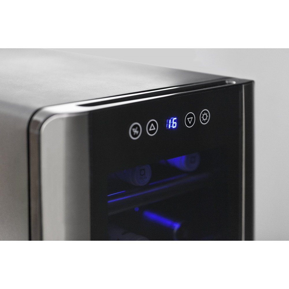 Винный шкаф CASO WineCase 6 предназначен для охлаждения и длительного хранения бутилированного и разливного вина в частных домах, квартирах, отелях и офисах. Модель оснащена сенсорной панелью управления c LED-дисплеем, показывающим текущую температуру, и 3 выдвижными полками. Дверная рама и ручка выполнены из нержавеющей стали, дверца - из стекла.