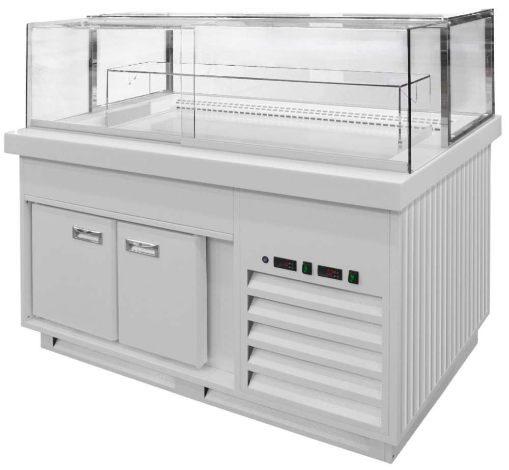 Витрина кондитерская Finist Maria Msv-17-9 используется для демонстрационной выкладки, охлаждения и хранения кондитерских и хлебобулочных изделий на предприятиях общественного питания и торговли. Модель оснащена микропроцессорным блоком, автоматической оттайкой, охлаждаемой камерой, выдвижной полкой, подсветкой и дверьми-купе. Материал фронтальных и боковых панелей облицовки - МДФ панели, материал купола и полок - просветленное стекло, материал зоны выкладки и столешницы - искусственный камень.