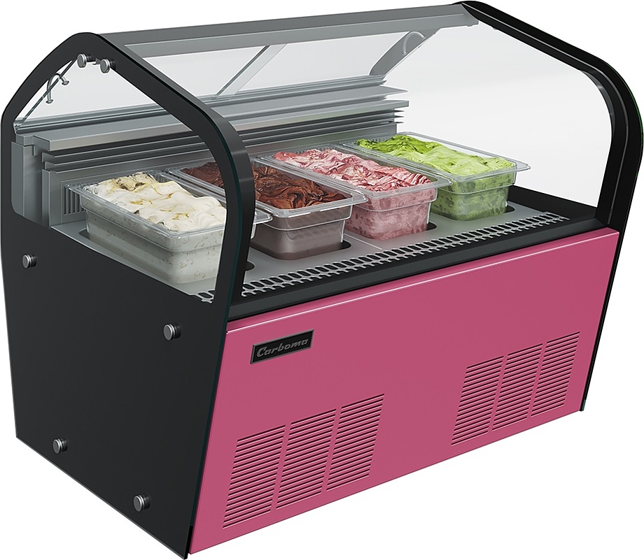 Витрина для мороженого Carboma I60 VL 0,8-1 JOY предназначается для охлаждения, хранения и демонстрации мороженого на предприятиях общественного питания и торговли. Управление при помощи электронного блока Carel, динамическая система охлаждения. Витрина оснащена прозрачным изогнутым фронтальным стеклом и 2 боковыми стеклопакетами. Опоры регулируются по высоте. Материал каркаса - сталь с антикоррозийным покрытием, материал фронтальной панели - сталь с красным покрытием (RAL 3004), материал экспозиционных поддонов - нержавеющая сталь, материал гастроемкостей - прозрачный поликарбонат, материал термоизоляции - пенополиуретан.