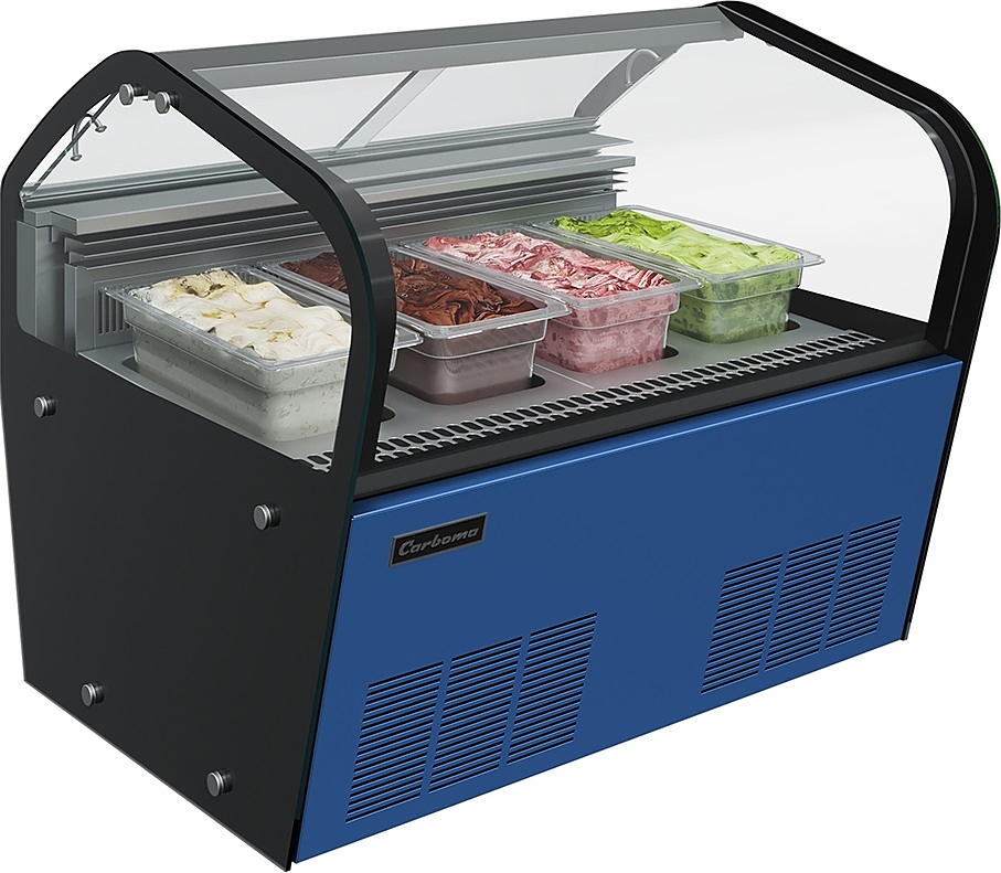 Витрина для мороженого Carboma I60 VL 0,8-1 JOY предназначается для охлаждения, хранения и демонстрации мороженого на предприятиях общественного питания и торговли. Управление при помощи электронного блока Carel, динамическая система охлаждения. Витрина оснащена прозрачным изогнутым фронтальным стеклом и 2 боковыми стеклопакетами. Опоры регулируются по высоте. Материал каркаса - сталь с антикоррозийным покрытием, материал фронтальной панели - сталь с синим покрытием (RAL 5017), материал экспозиционных поддонов - нержавеющая сталь, материал гастроемкостей - прозрачный поликарбонат, материал термоизоляции - пенополиуретан.